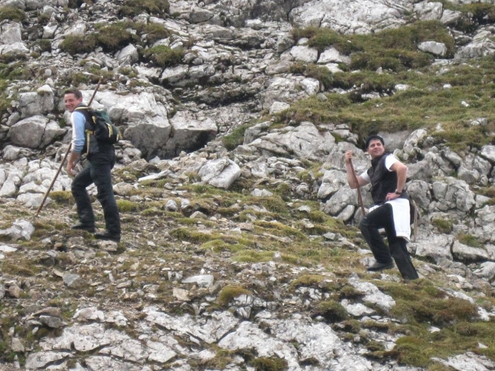 Gegen 10.30 Uhr wurde die rasch vorbei ziehende Schafherde am 1553 Meter hoch gelegenen Lehnberghaus von den Hüttenwirten Hans und Linde Auer begrüßt. Dass von Linde Auer zugerufene Angebot, doch auf ein „Schnapserl“ zu zukehren, war zwar verlockend, ließ aber der straffe Zeitplan der Hirten nicht zu. Das nächste Ziel musste erreicht werden, damit sich die Tiere erholen konnten und das war eine große Koppel am Gasthaus Arzkasten. Dort wurde von 11 bis 12.15 Uhr eine erste Pause eingelegt.