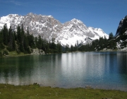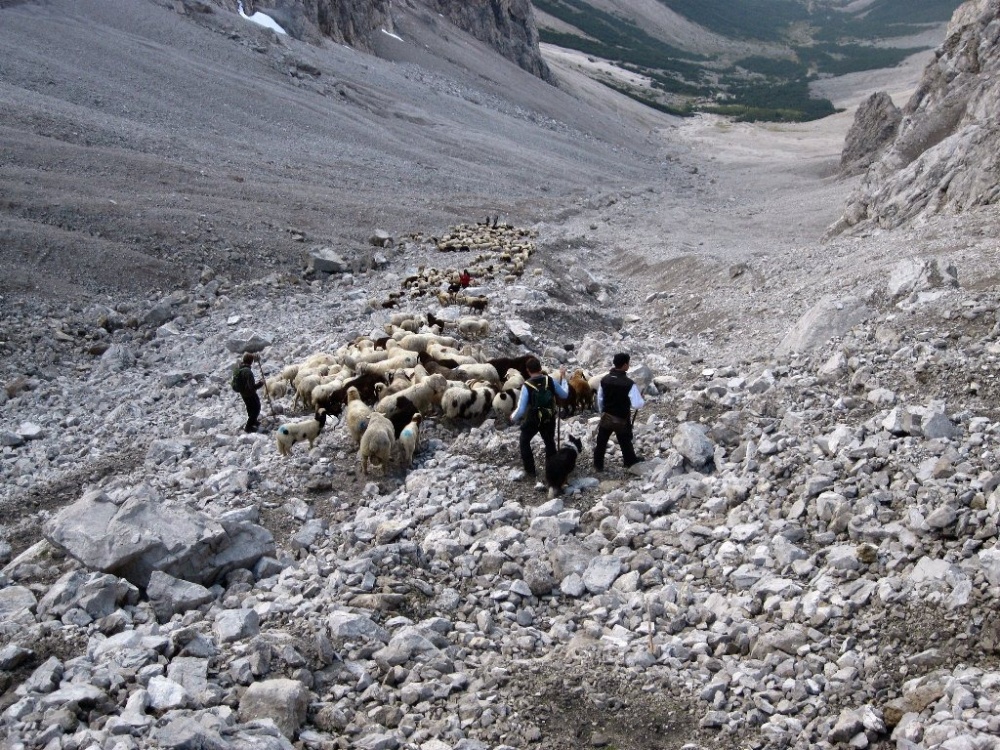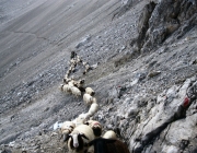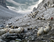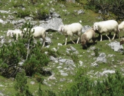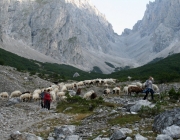 Um die 530 weiße, schwarzweiße, braunweiße, schwarze und Tscheggenschafe wurden ab Freitag gesammelt und auf eine Koppel am oberhalb der Seeben-Alm gelegenen Seebensee (1650 Höhenmeter) getrieben. Keine leichte Aufgaben für die Hirten, denn die Schafe weiden auch auf den umliegenden Bergen. Am Sonntagmorgen, pünktlich um 7 Uhr machte sich die Herde auf ihren Weg. Der führte zunächst durch das Klamml, zur Coburger Hütte (1917 Meter) und von dort, am Weg zum Oberanger, vorbei am Tajatörl, zur Grünsteinscharte. Gegen 9 Uhr passierte die Schafherde die 2272 hoch gelegene Grünsteinscharte. Wenig später den Ursprung, die Quelle der Gemeinde Obsteig und zog Richtung Lehnberghaus.