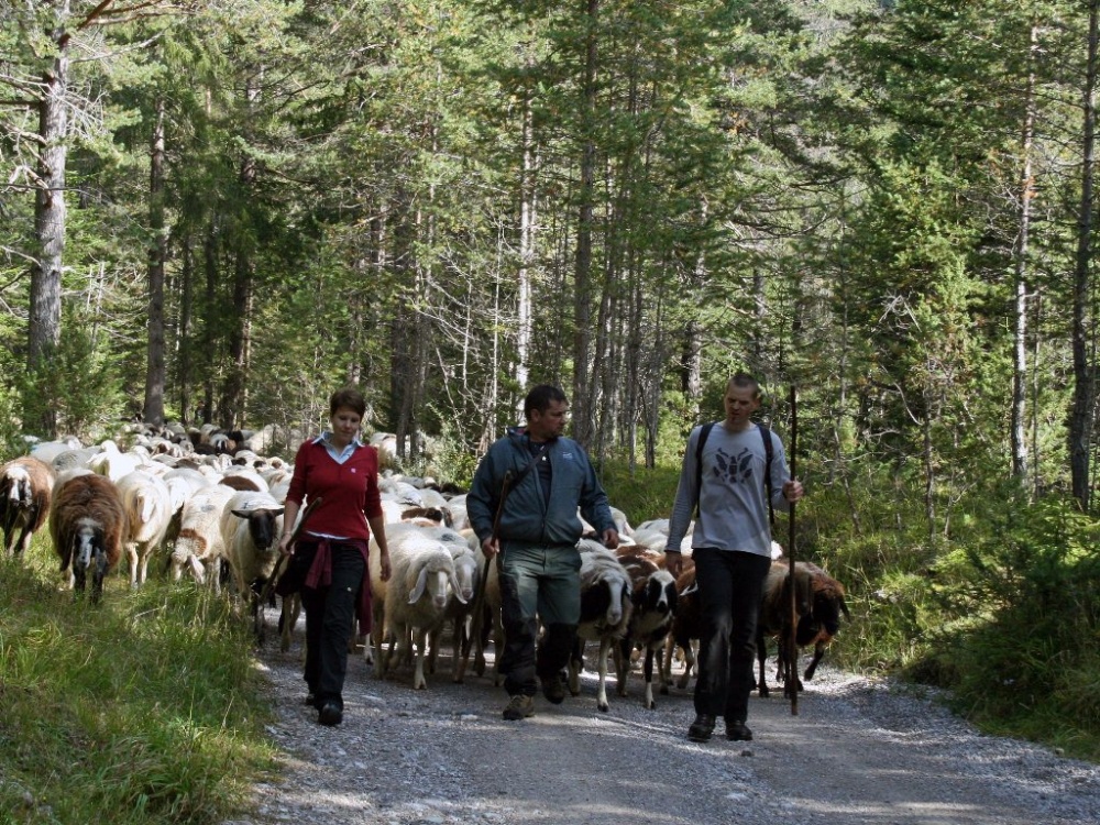 Voraus gingen Manni Krug (Obmann Tscheggenschafverein Mieming), Marissa und Hermann Neuner. 12 Hirten der Agrargemeinschaft Seeben-Alm / Untermieming trieben ihre buntgemischte Herde von der Seeben-Alm, vorbei an der Coburger Hütte – über die Grünstein-Scharte, am Lehnberghaus und dem Gasthaus Arzkasten vorbei – zum Mieminger Plateau. Ziel war eine Koppel beim Gasthof Stiegl in Untermieming.