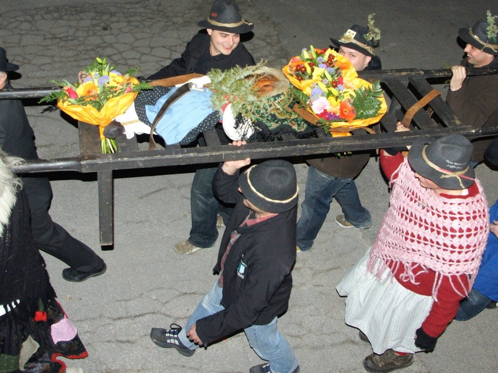 „Aber das Beste, waren die Aufführung und die Wagen-Feschte“, resümierte in seinem Gedicht zum Ausfliegen der Fasnacht, Siggi Auer. „Es tian zwor nit alle an Spaß verstien, ober trotzdem war es für die meisten wunderschian“. Die Obleute vom Fasnachtskomitee allen voran der Liechtmessverein, die Doig’n, Hexen & Bären, Schnapsbrenner & Panscher, Heilige Cäcilia, Mieminger Laniger und die Krameter trugen die Stöttlhex aufgebahrt und feierlichen Schrittes in die sternenklare, kalte Nacht hinaus. Keiner der Träger registrierte, dass sich ihr wertvolles Gut im Dunkel der Nacht unbemerkt verabschiedete und davonflog. „Tschüß und Adé, hebe ab und flieg in den Stöttl, in den tiefen Schnee“.
