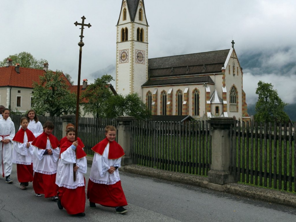 Den Einzug zur Pfarrkirche in Untermieming führte die Musikkapelle Mieming an, gefolgt von den Messdienern mit Pfarrer Paulinus, den Feuerwehrgoteln, der Pfarrgemeinde sowie den aktiven und passiven Mitglieder der Feuerwehr.