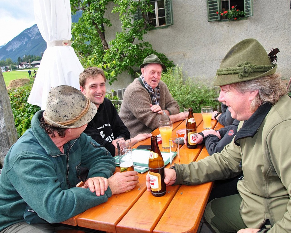 Nach der Ankunft in Untermieming versammelten sich die Hirten, ihre Familien und Freunde im Gasthaus Stiegl. Die meisten. Die anderen waren gegenüber beim Neuwirt. Am Stammtisch wollten die Altvorderen alles genau wissen. Wie war das mit dem Schnee? Haben die älteren Lampelen mitgehalten? Kam es zu weiteren Überraschungen und so weiter. Kaum einer, der am Tisch saß, war noch nicht dabei gewesen. Die Tradition der „Schafschoad“ wird in Untermieming seit Jahrhunderten hoch gehalten. Der letzte Weg der Tiere in ihre Winterställe – nach der „Schafschoad“ – dem Trennen der Tiere, war recht vergnüglich. Die meisten wären in dieser Nacht allerdings am liebsten auf der kleinen Stiegl-Koppel geblieben. Ein Schafleben ist auch nicht leicht. Von den drei Monaten auf der Sommer-Alm mal abgesehen.