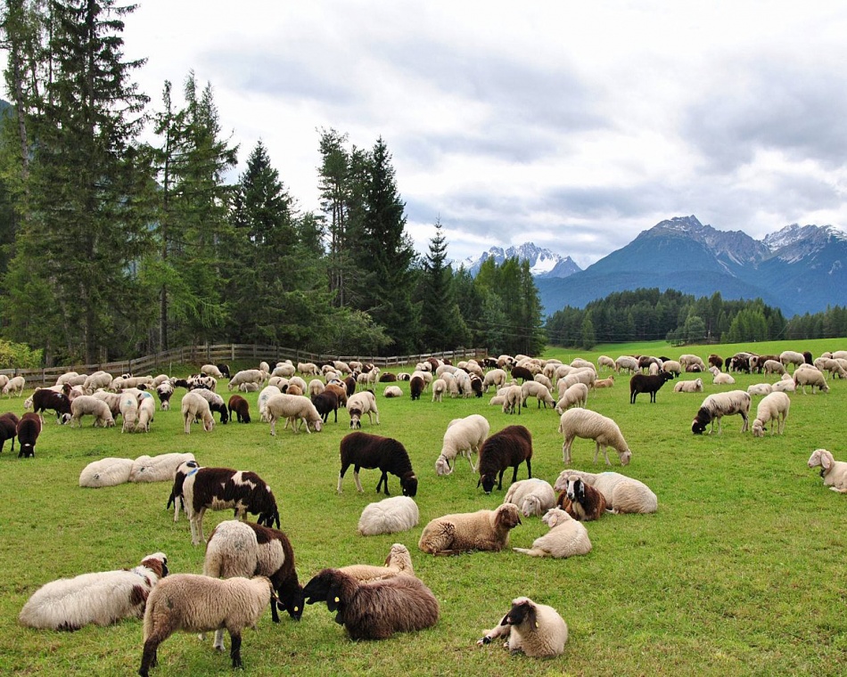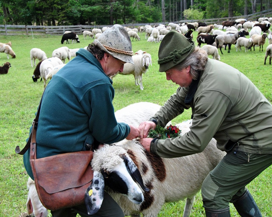 Von der Mauer herab schauten sie zu ihrer Herde, die den Hirten ins Ziel folgte. Der überwiegende Teil, der „Multikulti-Schafherde“, war zuerst an der Stiegl-Koppel. Hatte es geschafft. Weiße Tiroler Bergschafe und jede Menge Tscheggen. Der Stiegl-Toni reservierte ihnen zur Begrüßung „grünes Futter“ in Hülle und Fülle. Mensch und Tier machten angespannte Gesichter. Die Tour war kräftezehrend. Vom Seeben-See, vorbei an der Coburger Hütte, dem Drachensee und über den höchst gelegenen Pfad der Mieminger Kette, der 2272-Meter hohen Grünsteinscharte. Vorbei am Lehnberghaus, bei den Auers, bis zum Arzkasten von Bernadette Thaler. Der erste, der am Ende eines langen Weges wieder ein Lächeln im Gesicht zeigte, war der Neuner Hermann.