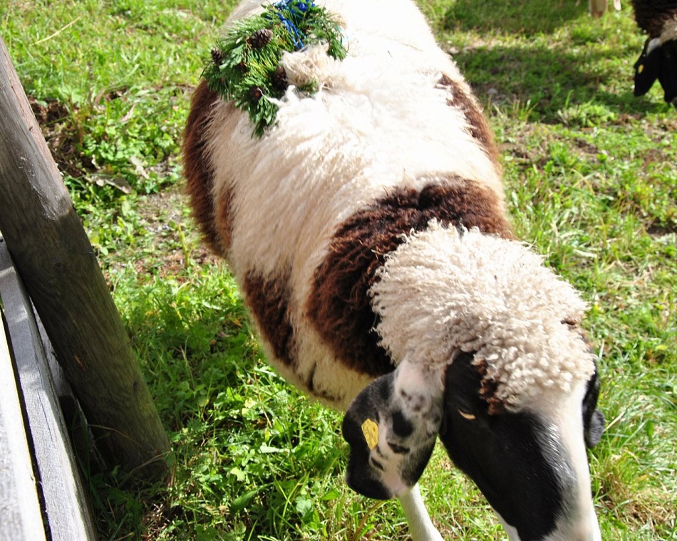„Ich glaube es lag am Schnee, der, für die Jahreszeit, mit über 20 Zentimeter schon sehr hoch war, dass wir so ein Tempo ‚drauf hatten“, sagte Dietmar Maurer, der gemeinsam mit Gerhard Wiggens, wie in den Vorjahren die Vorhut bildete. „Wir sind erst zwischen 11 und 12 Uhr Uhr aufgebrochen und waren schon um „7“ am Abend zuhause“. – „Wenn wir keinen Schnee gehabt hätten, wären wir im tiefen Boden eingesackt“, erzählte Didi Oberdanner.  Das der späte Aufbruch riskant war, sagt er uns dann am Rande des Protokolls. Am traditionellen Rastplatz, dem Vorberg der Familie Thaler vom Gasthaus Arzkasten bei Obsteig, wurden die Schafe mit einem Gebinde aus Fichtenzweigen, Blumen und Bändern geschmückt. „Kein Tier kam in diesem Almsommer zu Schaden“, sagte Gerhard Wiggens, der heuer einen guten Job gemacht hat. „Das ist meist vom Glück abhängig, denn unsere Schafe sind alpine Kletterer, die sich manchmal auf der Suche nach den höchsten Futterplätzen übernehmen und abstürzen“. Das kommt oft vor.