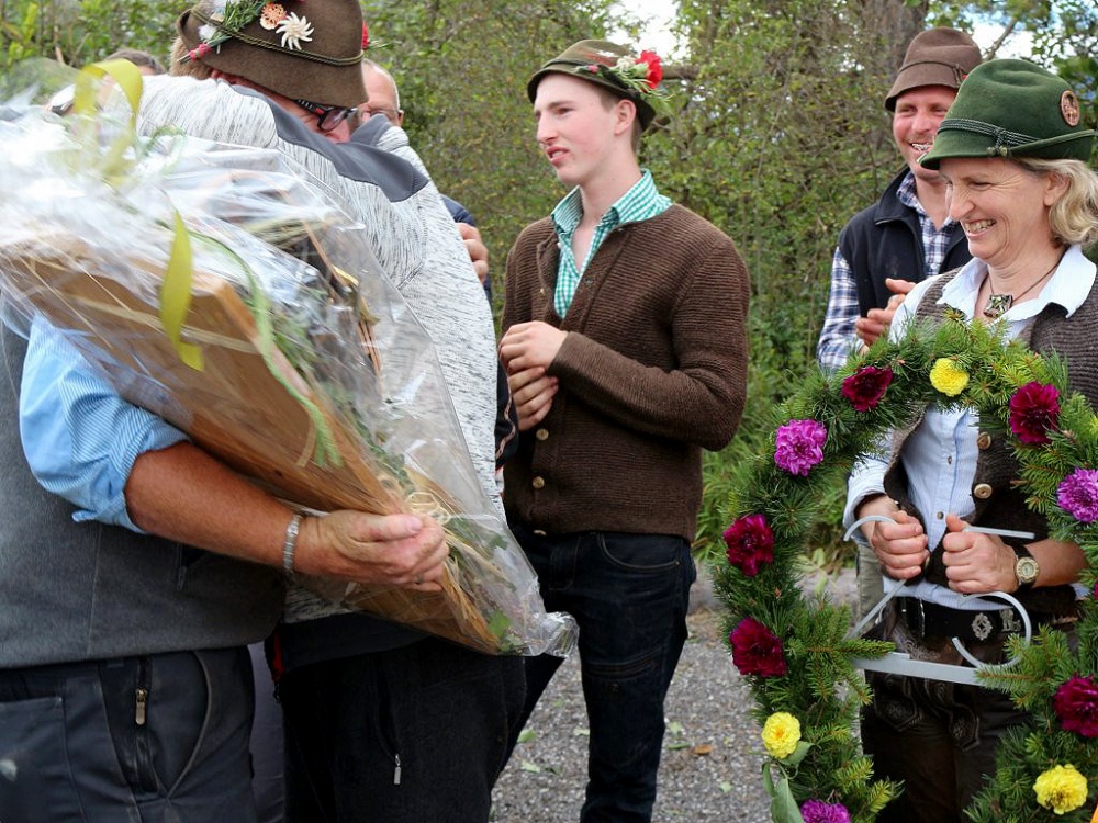 Gefreut haben sich die Kluckners und die Obermieminger Bauern über “unsere Kollegen und deren Familien aus den anderen Ortsteilen unserer Gemeinde, die es sich nehmen lassen, an unserer Seite zu sein”. Die Althirten, die Almobleute der Nachbar-Almen.
