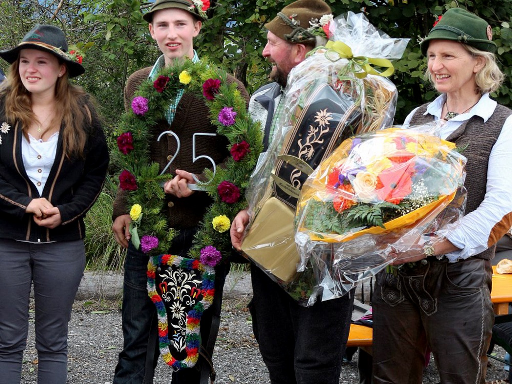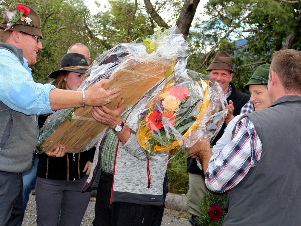 Gefreut haben sich die Kluckners und die Obermieminger Bauern über “unsere Kollegen und deren Familien aus den anderen Ortsteilen unserer Gemeinde, die es sich nehmen lassen, an unserer Seite zu sein”. Die Althirten, die Almobleute der Nachbar-Almen.