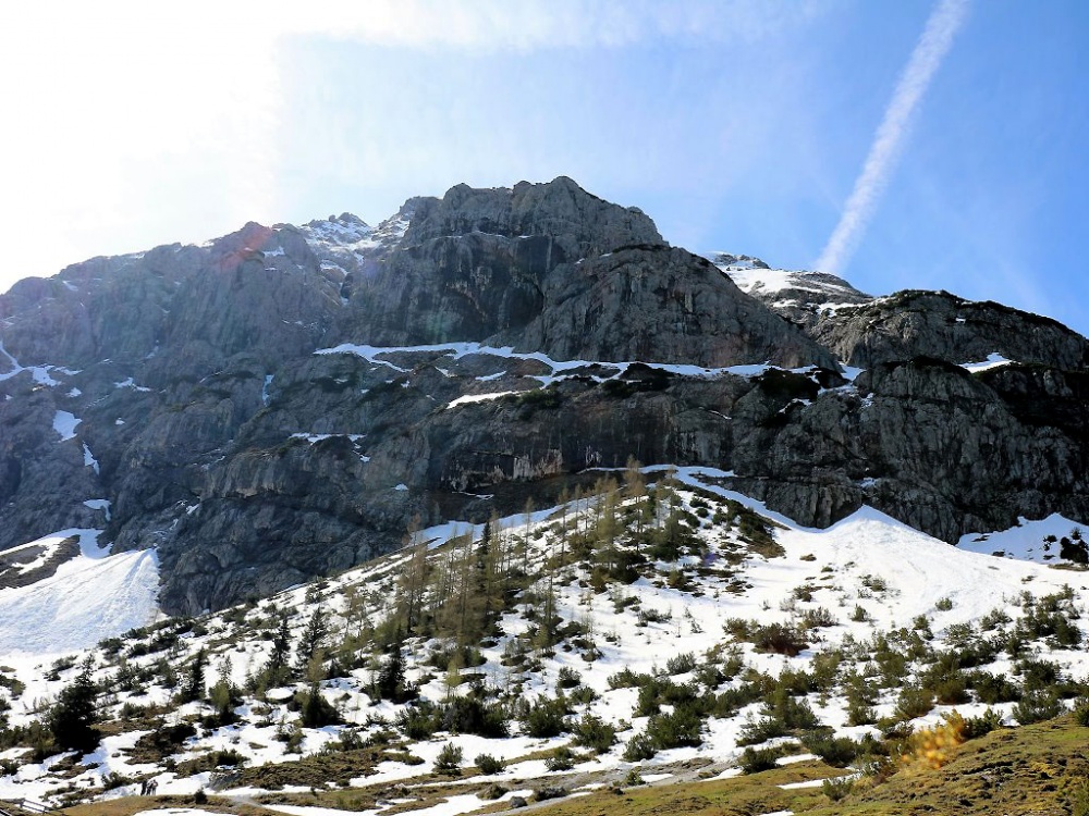 Die Almwege waren an diesem Tag zwar schon weitgehend befahrbar, aber in besonderen Lagen noch schnee- und eisbedeckt. Die Almen erwachen aus ihrem Winterschlaf und zeigen sich schon an vielen Stellen in hellem Grün. Im jungen Gras schauen an den Sonnenseiten erste Frühlingsboten hervor. Überall sprießen die noch kleinen Almblumen.