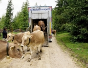Gemeinsam trieben Hirten und Bauern das Vieh in die Almvieh-Transporter. In drei Fuhren ging es zur Feldernalm. Sammelplatz und Ausgangspunkt zur Hochfeldern Alm war der Platz in der Nähe der Bienen und Bienenköniginnen gleich hinter dem Gatter.
