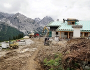 Seppl Sonnweber, Konrad Scharmer, Franz Kapeller, Andreas Scharmer, Laurin Kapeller, Klaus Scharmer, unterstützt von den Hirten Fabio und Martin waren das Arbeitsteam. Der Plan: Die Kapelle mit dem Bagger anheben und auf den neuen Platz bringen. Jetzt zeigten die Männer ihre Teamfähigkeit, Kreativität und ihre Praxiserfahrung. Wie gesagt, ein Musterbeispiel, ohne viel heiße Luft, flip charts, Gruppenarbeiten, feedback Runden, was halt da so üblich ist 😉