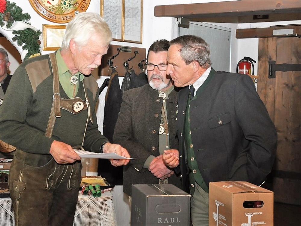 Die Glücksfee bei der Verlosung meinte es gut mit: Hermann Thaler, Martin Schmid und Hermann Zauscher. Die Glücklichen bedanken sich an dieser Stelle bei den jeweiligen Jagdpächtern für diese großzügige Spende. Welche Mühe sich die Organisatoren dieser Jubiläumsveranstaltung gemacht hatten, kam in dem reich mit Preisen gedeckten Tisch zum Ausdruck.