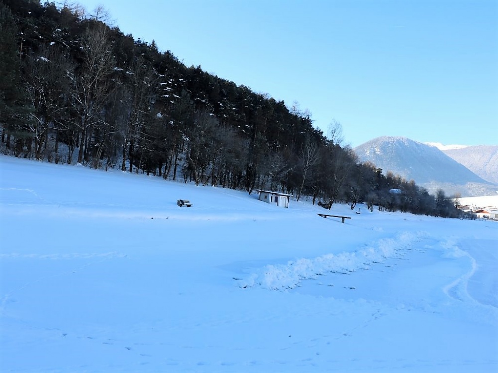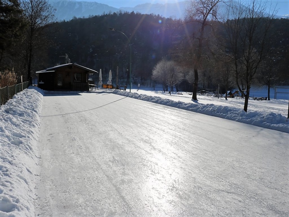 Der Badesee Mieming lädt zum Schlittschuhlaufen ein.