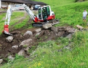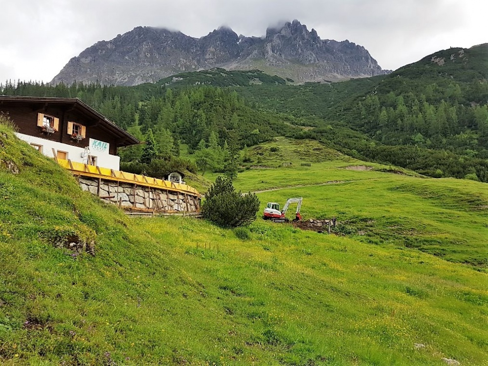 Die Terrasse wird mit einem Lerchenholz-Fußboden bedeckt. Aus dem gleichen Holz wird auch der Zaun gebaut. Alles ruht auf fest-gegossenen Fundamenten mit stabiler Hinterfüllung. „Wir werden mit der neuen Terrasse um ca. 40 Quadratmeter mehr Platz für die Gäste der Marienberg Alm haben“, sagt der Almobmann. Für die Erd- und Baggerarbeiten wurde Thomas Kail aus Gschwent engagiert, Christian Maurer aus Mieming-See war für die Fassaden-Isolierung und die Trockenlegung des Hüttenbetriebes verantwortlich. Neu in diesem Zusammenhang ist auch eine Drainage. Die Entwässerung des neuen Terrassenbodens war im Zuge der aktuellen Baumaßnahmen notwendig.