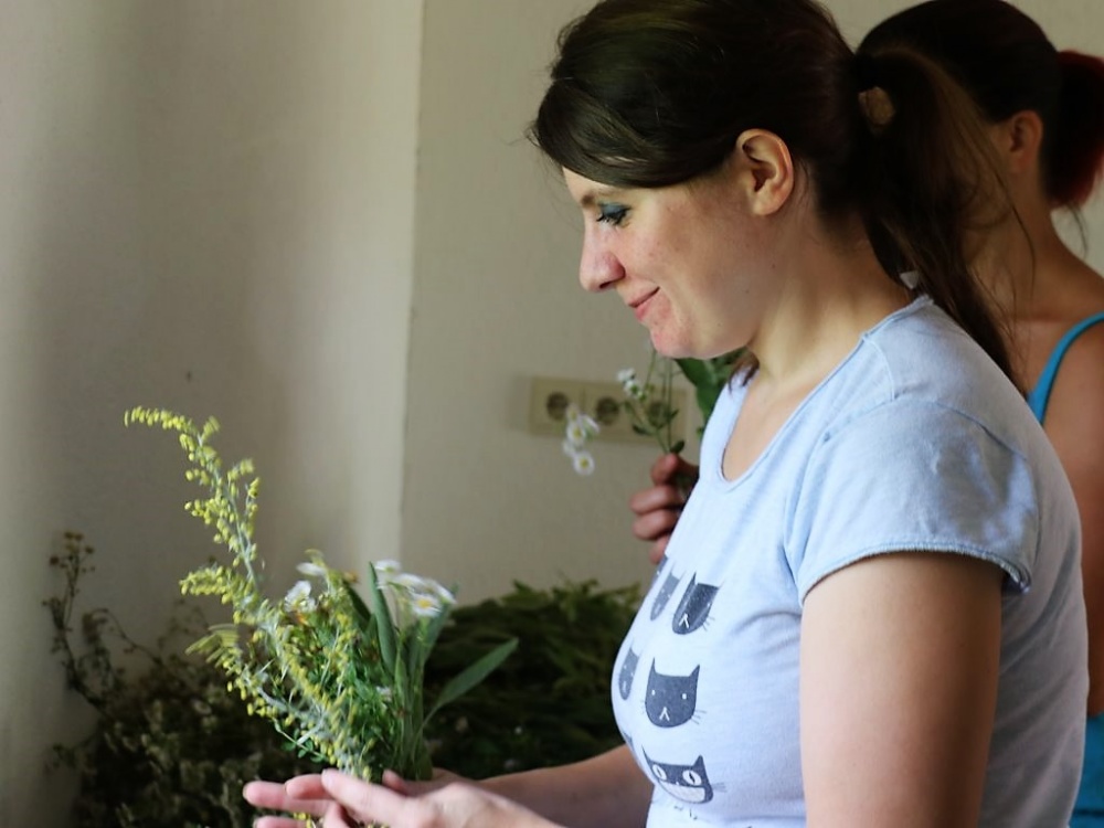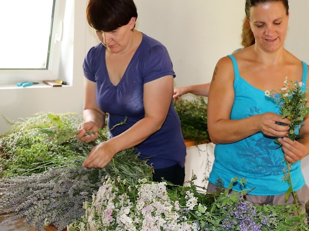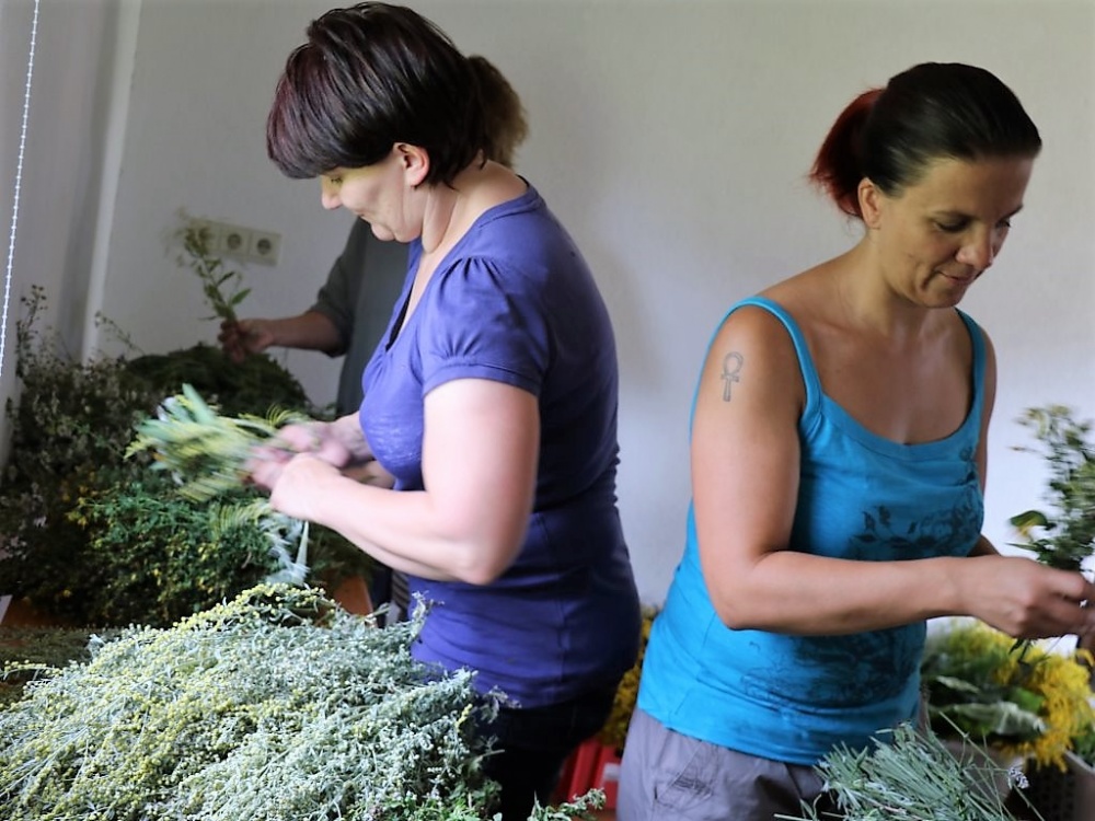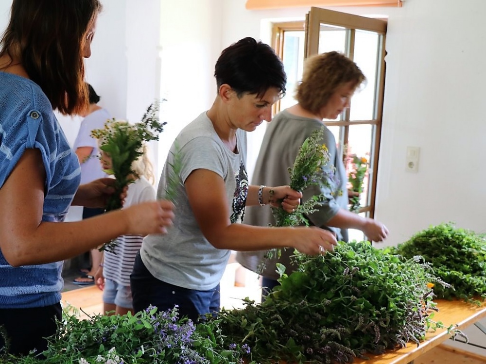 Die Mieminger Bäuerinnen trafen sich zum Kräuterbüschl binden im Widum der Pfarre Untermieming. In der Luft liegt der Geruch von zahlreichen Kräutern und Blumen. Die meisten gesammelten Kräuter wachsen am Feldrand. Daniela Kapeller nennt das gesuchte Kraut in Anlehnung an die Marienverehrung deshalb „Blume des Feldes“.