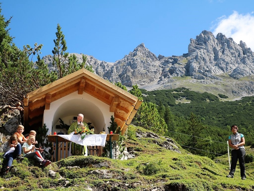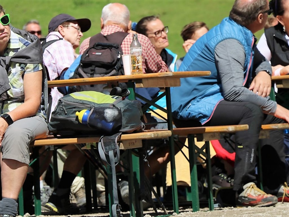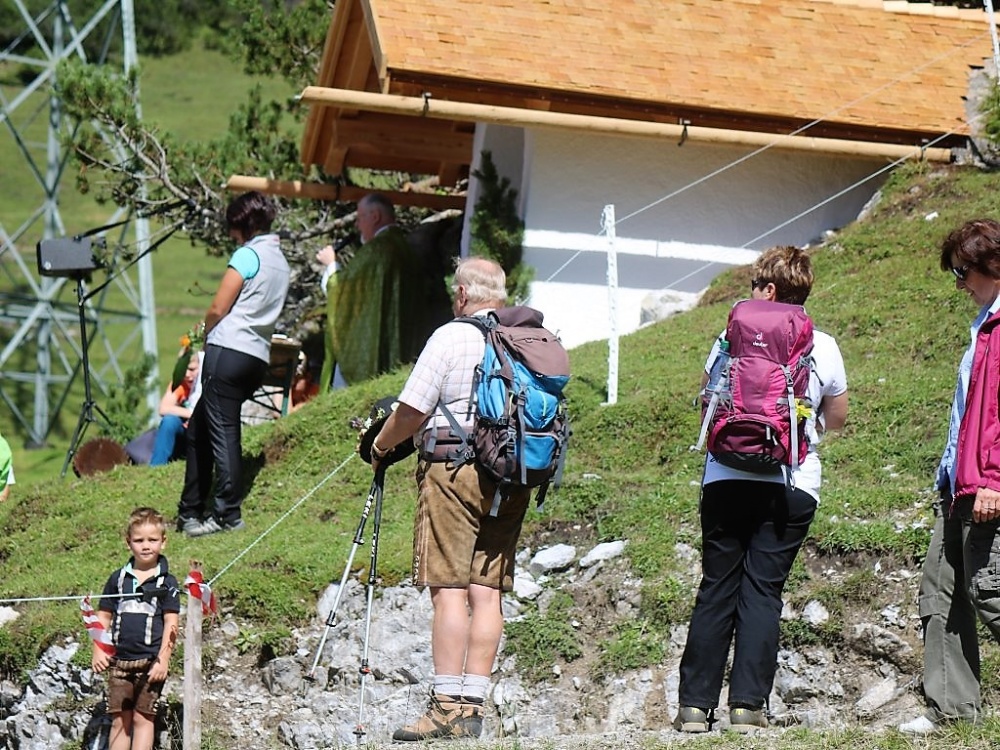 Aus allen Himmelsrichtungen kamen Bergler zur Bergmesse auf die Marienberg Alm. „Lasst uns erst gemeinsam die Almmesse feiern und erst anschließend das Almfest“, bat Abt German die versammelten Gläubigen. Sein Wort wurde gehört und von allen respektiert, die sich um die sanierte Marienbergkapelle herum zur Andacht versammelten. Radler und Bergwanderer unterbrachen ihre Tour und hörten auf das, was der Geistliche zu sagen hatte.