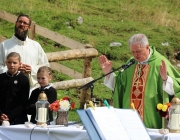 Abt Mag. Raimund Schreier (Stift Wilten) feierte die Almmesse. An seiner Seite Frater Pius, ein geistlicher Gast aus Polen. Für die musikalische Messgestaltung sorgten die Mieminger Sänger, unter der Leitung von Hans Holzeis, mit Unterstützung der Mieminger Weisenbläser. Im Anschluss an den Gottesdienst segnete der Wiltener Abt den neuen Lärchenholz-Brunnen der Hochfeldern Alm, den der Holzschnitzer und Bildhauer Reinhard Thöni aus Pfunds gestaltet hat. Auf einer Holztafel steht: „Gewidmet von den Almbauern Obermieming“. Die Idee dazu hatte Martin Spielmann.