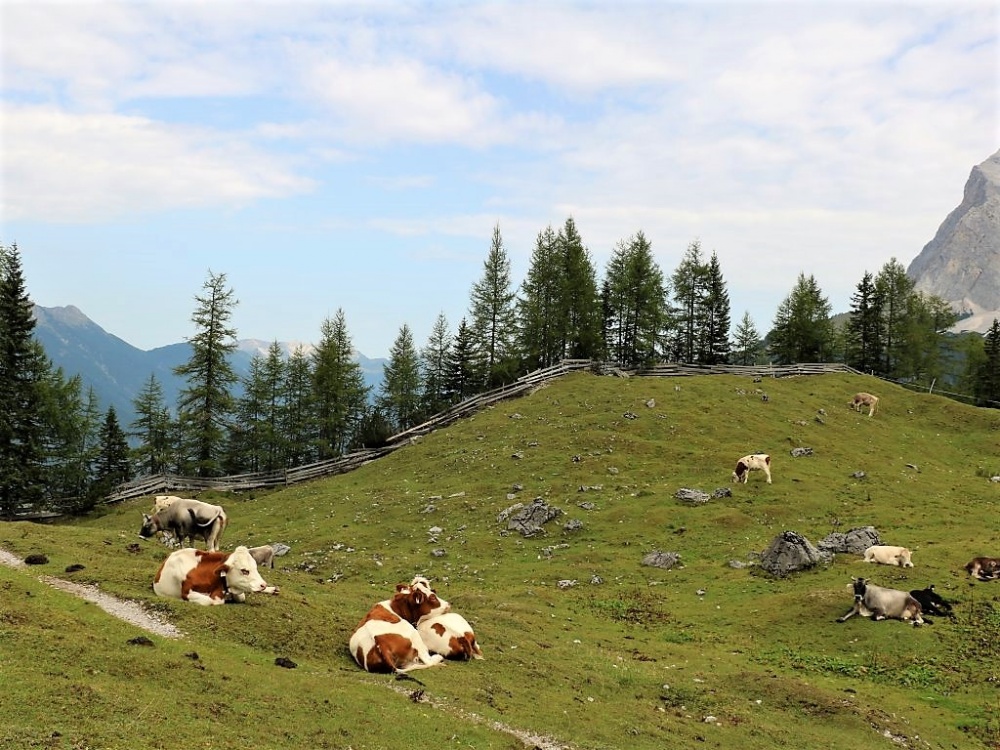 So kam es am vergangenen Samstag auf der über 1575-Meter hoch gelegenen Seeben Alm zu einem nicht alltäglichen Schauspiel. Almvieh und Wanderer begegnen einander von Angesicht zu Angesicht. Die Zweibeiner zücken ihre Handys und teilen dieses seltene Erlebnis mit Gott und der Welt. Die Vierbeiner wundern sich über so viel unerwartetes Interesse ihrerseits.