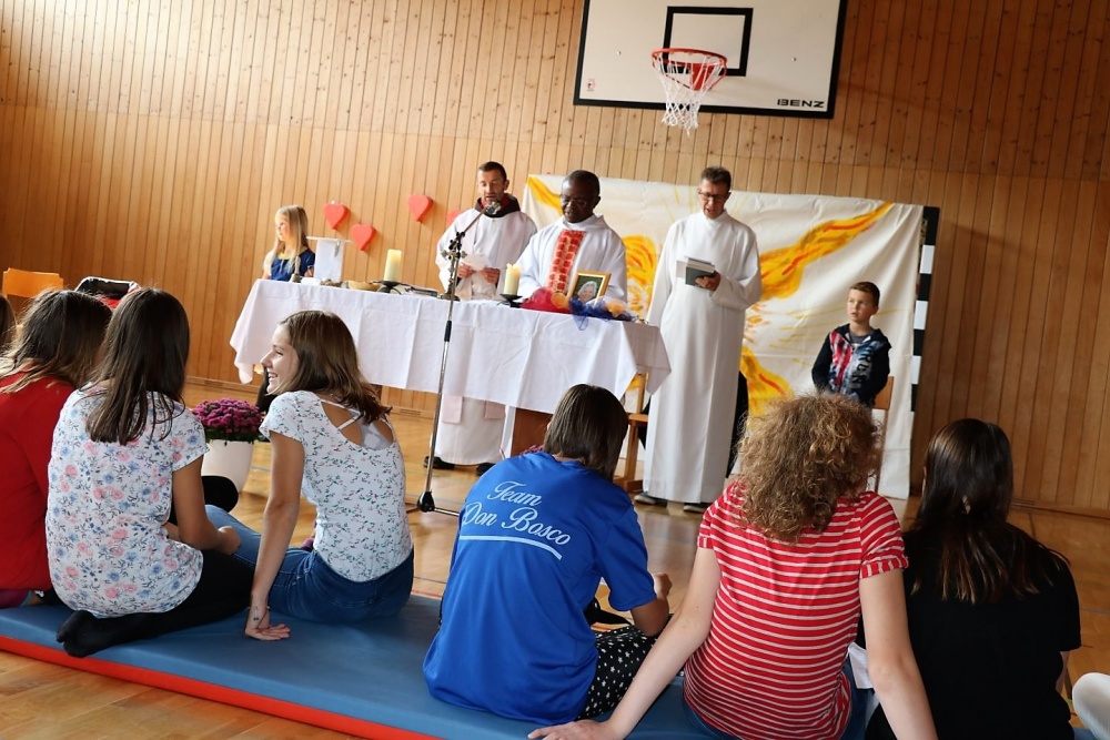 Vor der Predigt spielten Schülerinnen und Schüler zur Einstimmung vier Szenen aus dem Leben von Johannes Bosco. Don Bosco lebte vor 200 Jahren in Italien. Er war ein Vater von vielen armen Buben, die Halt suchten und einen guten Freund fürs Leben brauchten. Die heilige Maria Mazzarello kümmerte sich im gleichen Sinne für die Mädchen dieser Zeit.