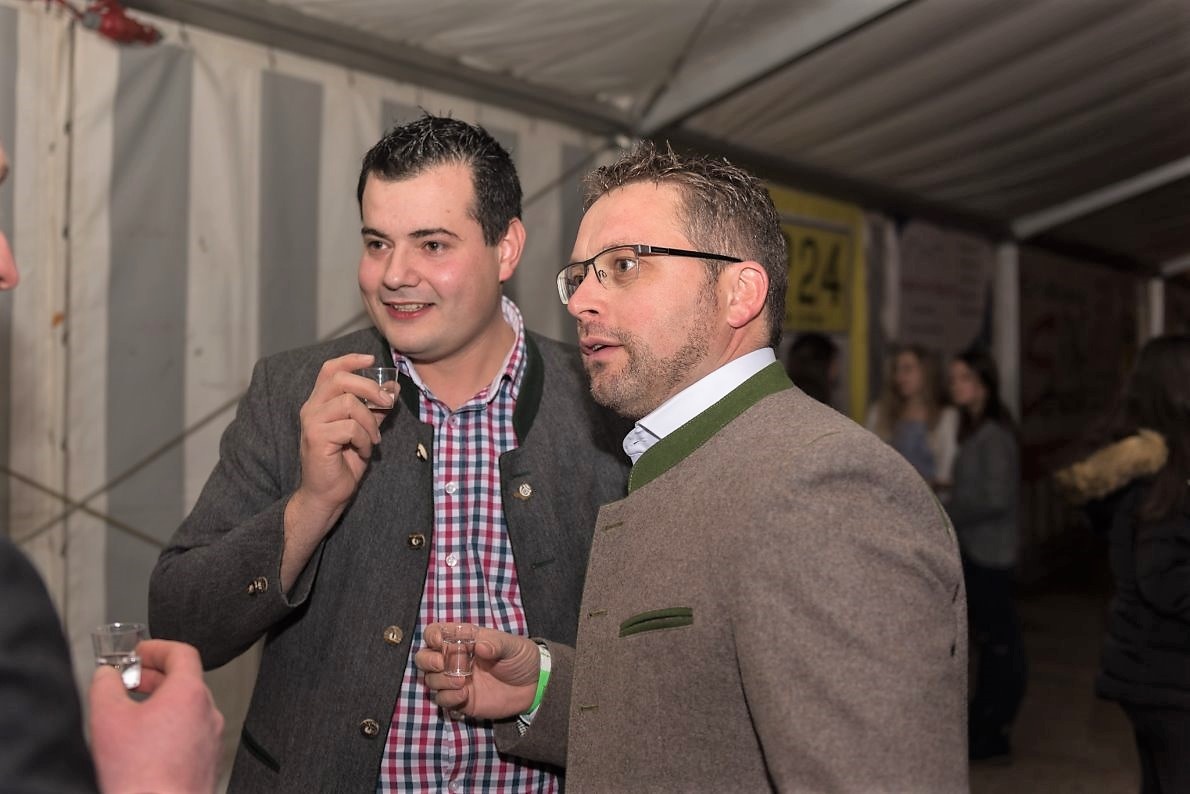 Alle Gäste wurden am Eingang vom früheren Obmann Michael Wallnöfer und seinem damaligen Stellvertreter Markus Scharmer mit einem hausgebrannten Schnapsl empfangen. Zur Begrüßung schüttelten die beiden viele Hände. Vor den Türen hatte sich schon lange vor der offiziellen Einlasszeit eine lange Warteschlange in Position gebracht. Nach Expertenmeinung ist das immer ein verlässlicher Hinweis auf einen erfolgreichen Jungbauernball.