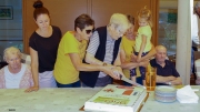 Anna Scharmer, die älteste Obermiemingerin, schneidet den Kuchen an. Ihre Familie in 4 Generationen assistierte dabei.
