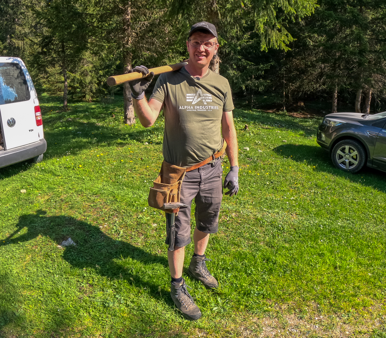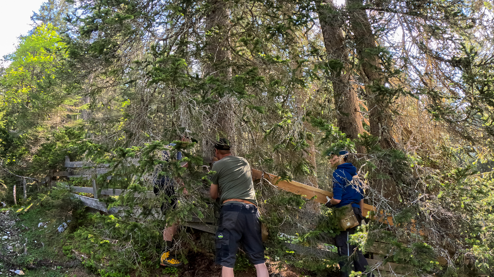 „Um 8te treffen wir uns bei mir“ war die kurz und bündige Nachricht von Almobmann Andreas Scharmer an die Obermieminger Almbauern. Es ging um das Reparieren der Zäune auf der Hochfeldernalm. Der Winter und das Wetter hatten ihre Spuren hinterlassen. Wenn einige Tage später dieTiere auf die Alm gebracht werden, muss der insgesamt etwa 4 km lange Weidezaun lückenlos sein.